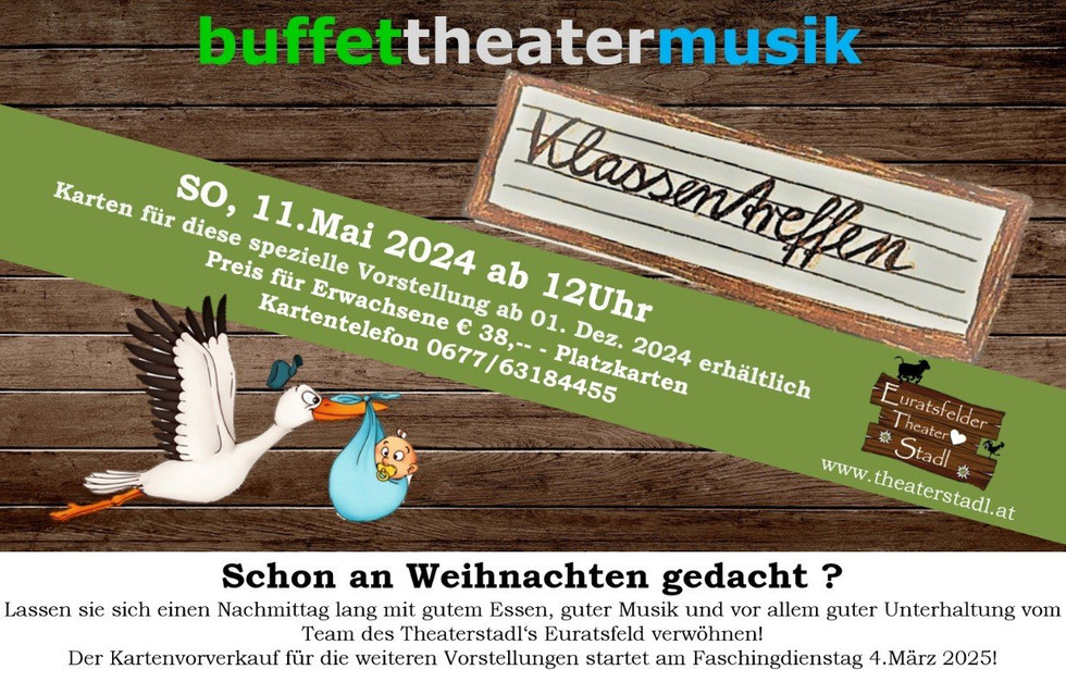 Die Suche nach unserem nächsten Stück war schwierig, aber wir konnten wieder einen unterhaltsamen Leckerbissen für euch finden. Es freut uns sehr im kommenden Frühjahr das Stück „Das Klassentreffen“ aufführen zu dürfen. Ihr könnt euch wieder auf spektakuläre Darbietungen freuen, bei denen kein Auge trocken bleiben wird. Wie jedes Jahr sind bereits wieder in der Vorweihnachtszeit die Karten für unsere Aufführung „BUFFETTHEATERMUSIK“ verfügbar. Der Vorverkauf für die restlichen Aufführungen startet traditionell am Faschingsdienstag. Wir freuen uns sehr auf euren Besuch!
